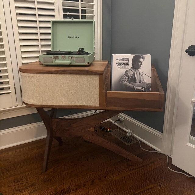 I purchased this stylish console to house a turntable and speaker. It is stunning, extremely well-crafted, and beautifully designed. Remy takes extreme care to update you on the process every step of the way, and his perfectionism and professionalism show in his work. He worked with me to get the speaker cover color correct for the room, as well as making sure it would align with another walnut piece near it. I would consider this an art piece and an heirloom for generations to come. So lovely, especially if you are a wood “nerd.” The walnut is exceptional.